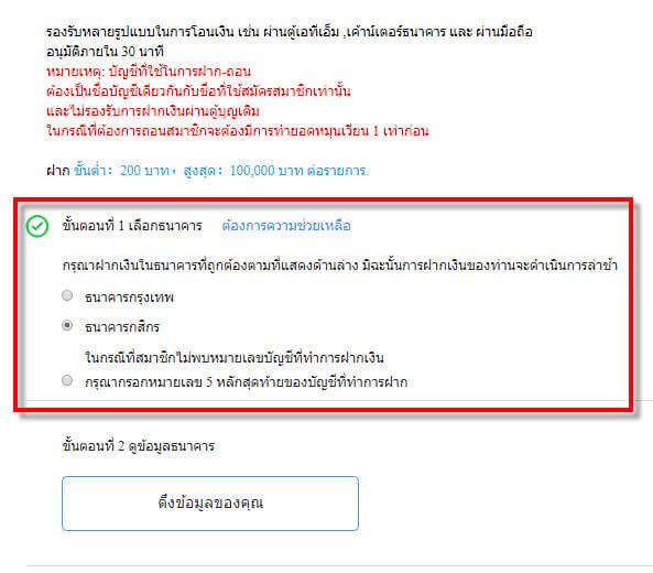 2.คลิกเลือกธนาคาร > ดึงข้อมูลเพื่อดูเลขที่ธนาคารของ Fun88