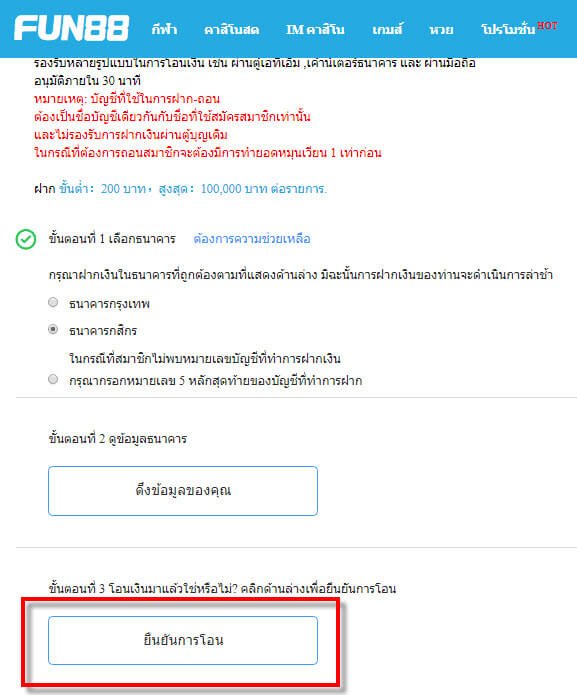 3.หลังจากทำการโอนเงินเข้ามาแล้วไปที่ขั้นตอนที่ 3 > คลิกที่ยืนยันการโอน